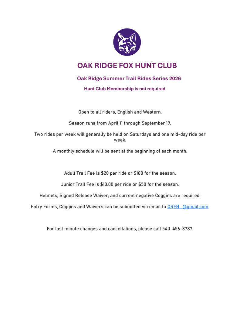 Oak Ridge Fox Hunt Summer Trail Rides Series 2026 Featured Posted on August 2, 2024 by cbakerfe39b53be5 2 Register online: https://orfhc.square.site/