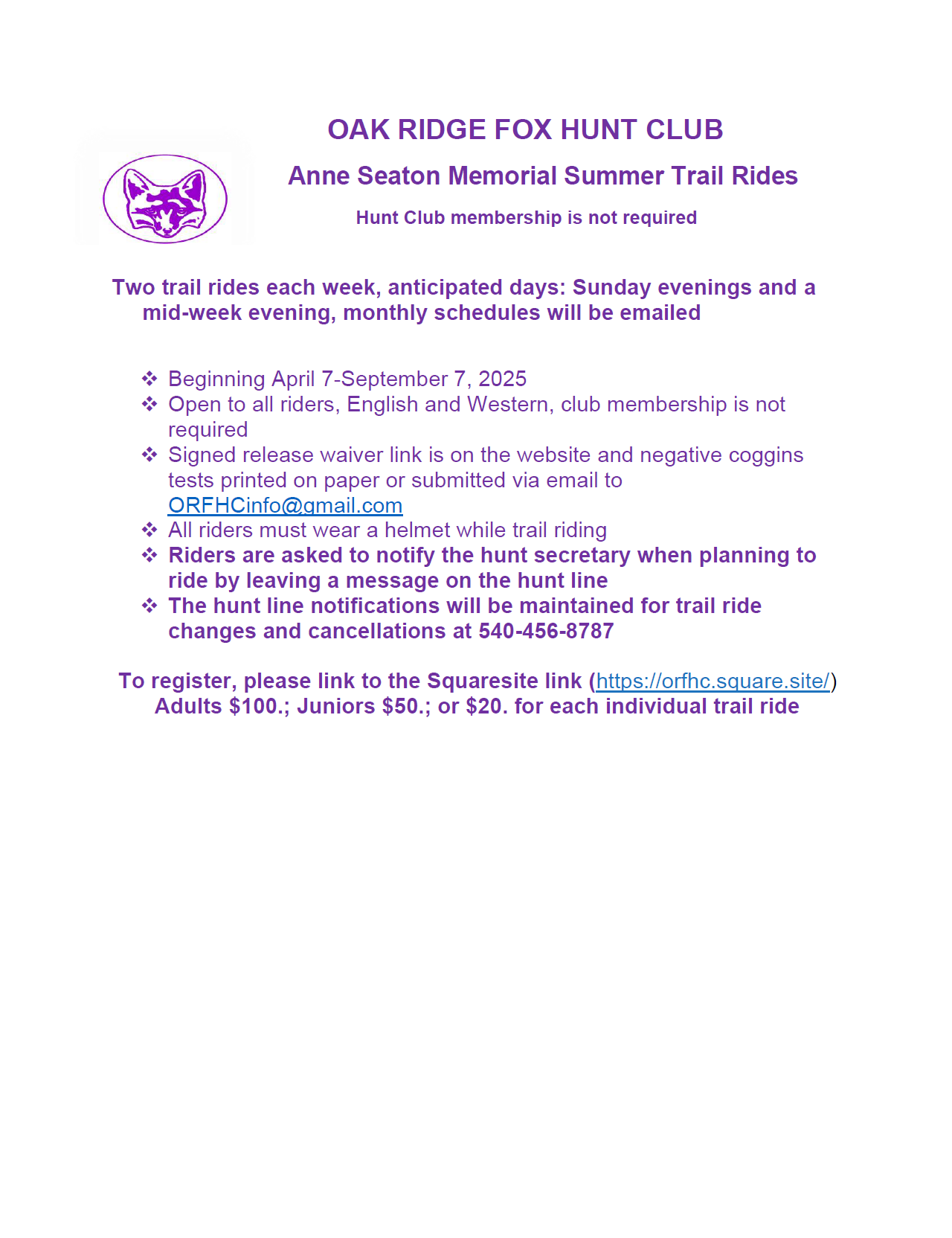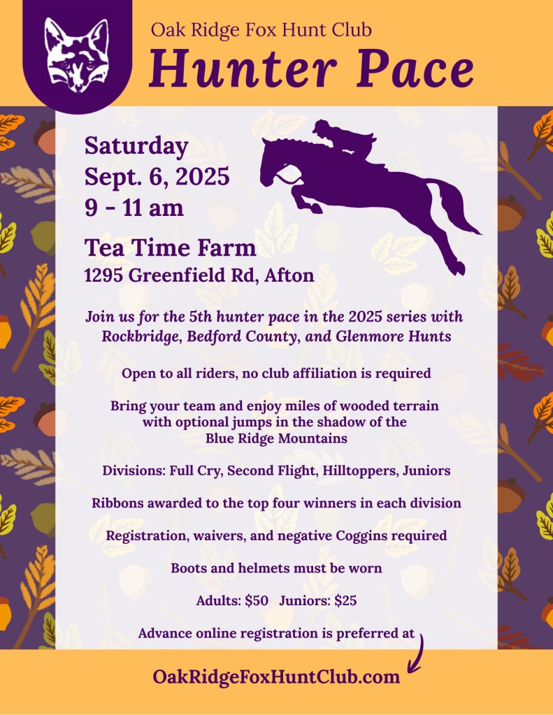 Oak Ridge Fox Hunt Club Hunter Pace: Saturday Sept. 6th, 2025 at Tea Time Farm Featured Posted on August 2, 2024 by cbakerfe39b53be5 2 Register online: https://orfhc.square.site/