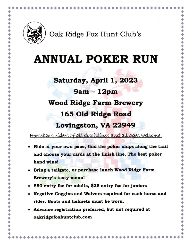 Proof of Negative Coggins required for horses. Bring a tailgate lunch or purchase food & beverages on site. Junior rider (under 17) discount accompanied by an adult. Fun for all, prizes awarded for best poker hands!